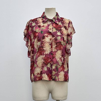 Vintage Floral Print Lapel Chiffon Short Sleeve Shirt Elegant Ruffle Sleeve Top
