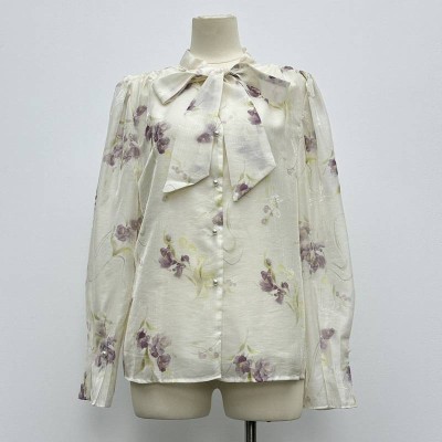 Bow Tie Print Long Sleeve Shirt Elegant Commuter Chiffon-like Top