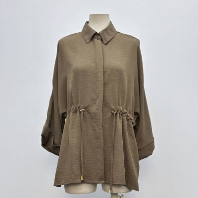 Simple Khaki Lapel Drawstring Waist Loose Shirt Top