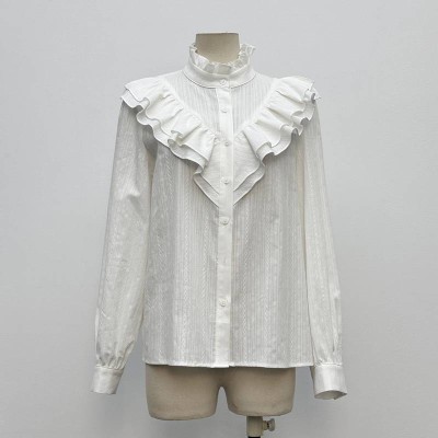 French Ruffled Stand Collar White Shirt Elegant Long Sleeve Jacquard Blouse
