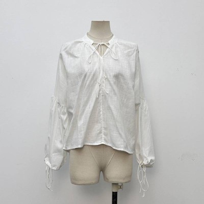 Simple White Tie-up Lantern Sleeve Loose Shirt Casual Long Sleeve Top