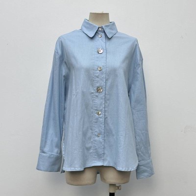 Light Blue Lapel Long Sleeve Shirt Loose Top With Decorative Buttons