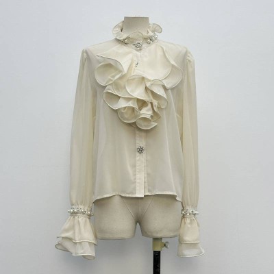 French Beaded Ruffled Stand Collar Chiffon Shirt Elegant Long Sleeve Sheer Unique Top