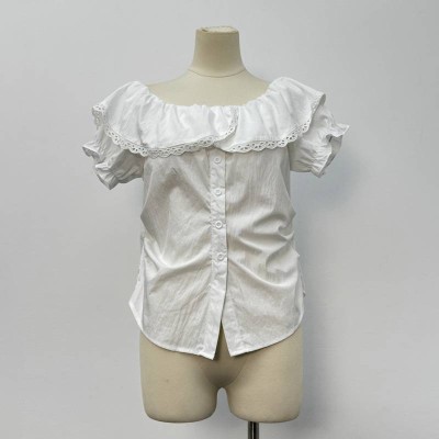 White Lace Off-the-Shoulder Short-Sleeve Shirt Square Neck Button-Down Sweet Top