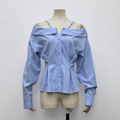 Designer Blue Off-Shoulder Camisole Waist-Cinched Shirt Niche Chic Long-Sleeve Top