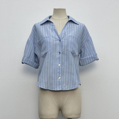 Blue and White Striped Lapel Short Shirt Loose Short Sleeve Button-up Top