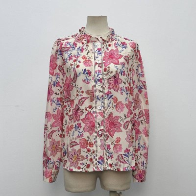 Vintage Floral Ruffled Stand Collar Long Sleeve Shirt Gentle Style Slim Fit Temperament Top
