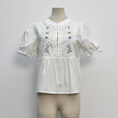 French Embroidery Puff Sleeve Stand Collar Shirt Loose Age-reducing White Short-sleeve Top