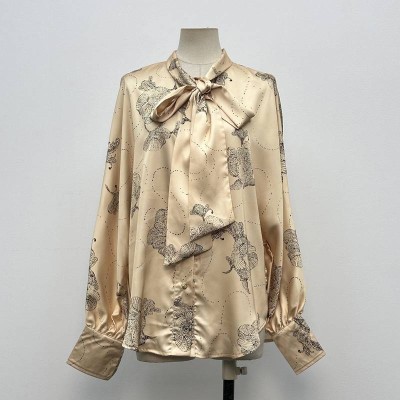 Satin Bow Tie Collar Printed Long Sleeve Shirt Elegant Commute Top