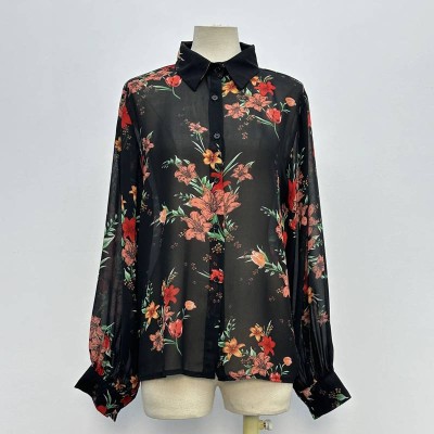 Vintage Black Floral Chiffon Shirt Long Sleeve Lapel See-through Women's Top