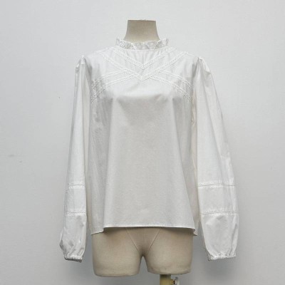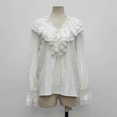 French Ruffled Stand Collar Long Sleeve Shirt Vintage Embroidered Loose White Top