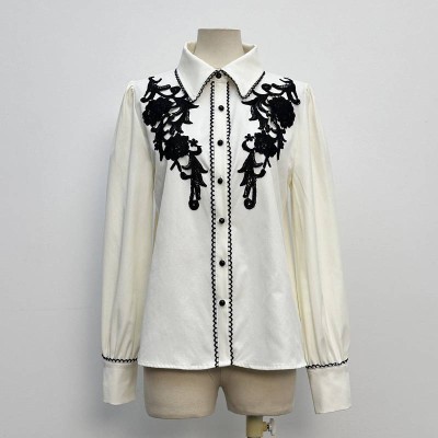 Vintage Contrast Color 3D Embroidery Lapel Shirt Elegant Long Sleeve Top