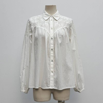 Vintage Embroidered White Lapel Shirt Loose Casual Long Sleeve Top