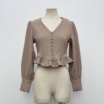 V-neck Plaid Cropped Waist Ruffled Long Sleeve Top