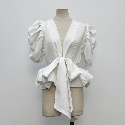 White V-neck Puff Sleeve Waist-tie Elegant Cropped Top
