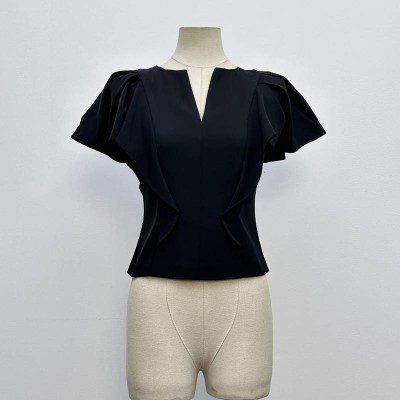 Black V-neck Ruffle Sleeve Waist Cinched Short Elegant Top