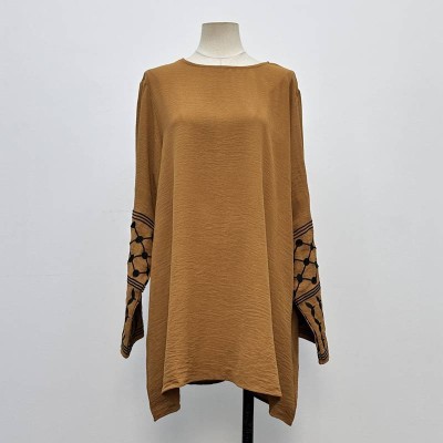 Vintage Pattern Cuff Loose Long Length Crew Neck Top