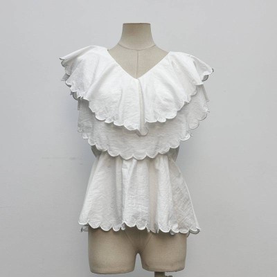 French Ruffled V-neck Sleeveless Top Waist Cinched Slimming Wave Edge Temperament White Top