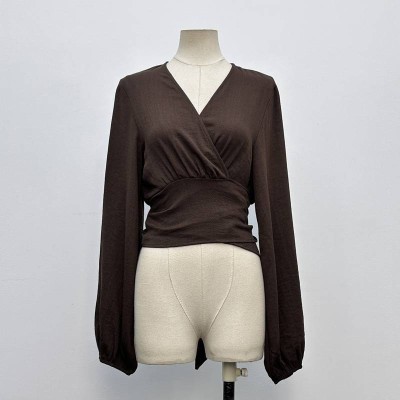 Dark Brown V-neck Waist-cinched Lantern Sleeve Cropped Top