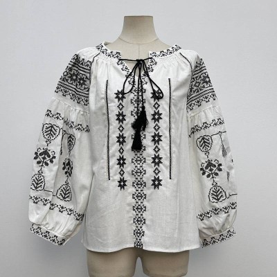 Vintage Ethnic Style Embroidered Tie-neck Long Sleeve Blouse