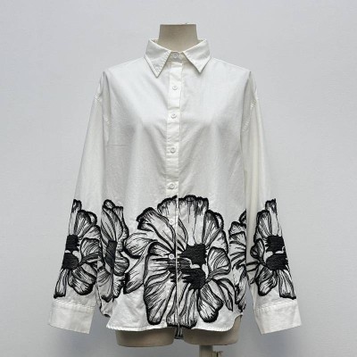 White Floral Embroidered Long Sleeve Lapel Shirt