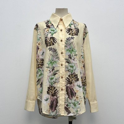 Vintage Plant Print Long-sleeve Lapel Shirt Loose Fit Commuter Blouse