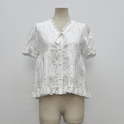 White Embroidered Lace Patchwork Puff Sleeve Top Loose Babydoll Chiffon Blouse