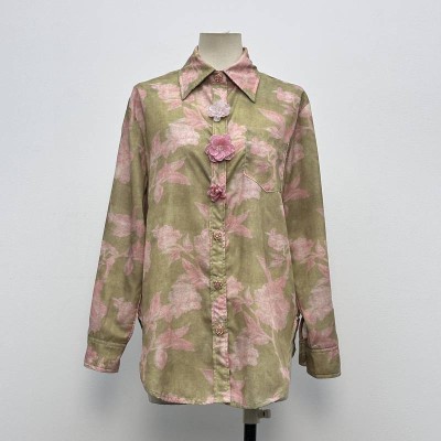 Vintage Pink Floral Decorated Lapel Long Sleeve Shirt