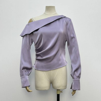 Elegant Satin Off-the-Shoulder Long Sleeve Top Temperament Asymmetrical Collar Pleated Slimming Base Shirt