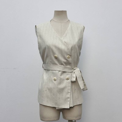 Vertical Stripe V-neck Sleeveless Waistcoat Belted Double-breasted Commute Top