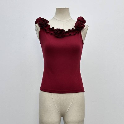Wine Red Sleeveless Camisole with 3D Flower Embellishments