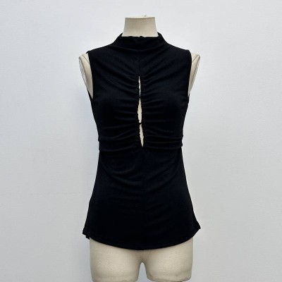 Black Mock Neck Ruched Cutout Sleeveless Slim Fit Top