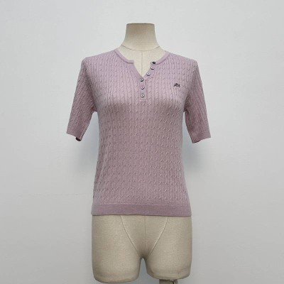 Light Purple V-neck Half-placket Elbow-sleeve Knitted Top