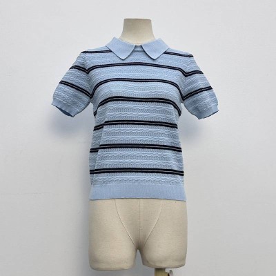 Fresh Blue-black Striped Polo Collar Short-sleeve Knitted Top
