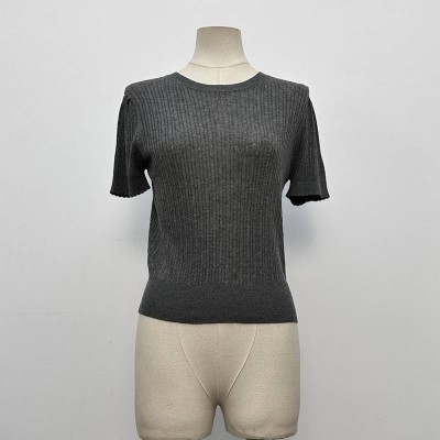 Grey Crew Neck Short Sleeve Ribbed Knit Top