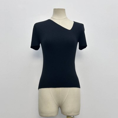 Black Asymmetrical Neck Short Sleeve Slim Fit Knit Top