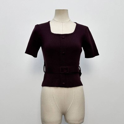 Burgundy Square Neck Short Sleeve Knitted Waist-cropped Top