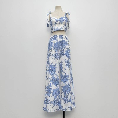 Blue And White Porcelain Print Camisole Cropped Top & Wide Leg Pants Two-Piece Set
