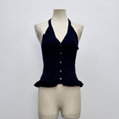 Navy Blue Halter V-neck Sleeveless Ruffle Hem Button-up Short Tank Top