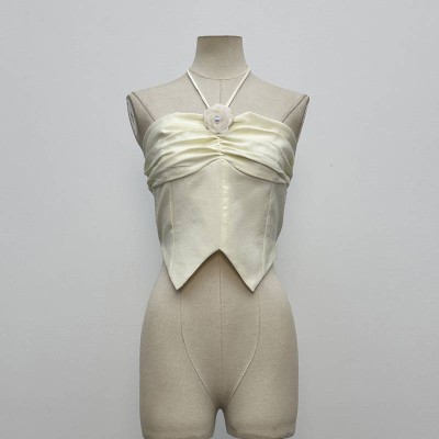 French Style Halter Satin 3D Flower Short Camisole Backless Top
