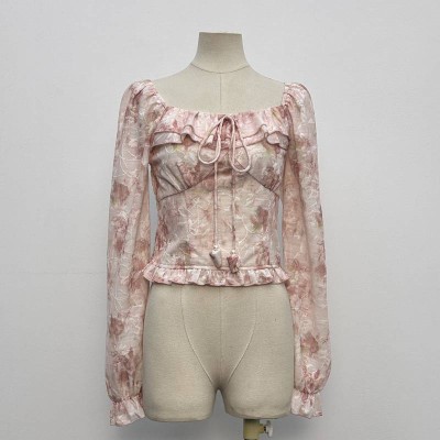 French Square Neck Tie-dyed Floral Chiffon Top Short Waist Cinched Lace-up Long Sleeve Blouse