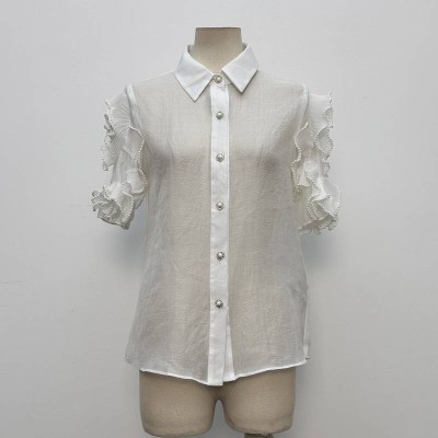 Elegant Diamond Button Ruffle Sheer Chiffon Shirt Short Sleeve Collar Blouse