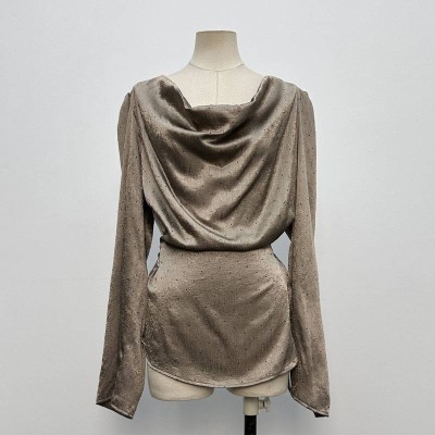 Elegant Draped Neck Rhinestone Velvet Texture Long Sleeve Top Waist-cinching Slimming Niche Blouse