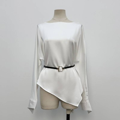 White Satin Batwing Sleeve Waist Cinched Irregular Hem Elegant Long Sleeve Top