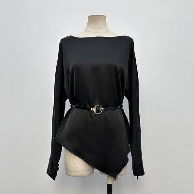 Elegant Black Satin Waist-cinched Irregular Long-sleeve Top Commute Slim Chic Top