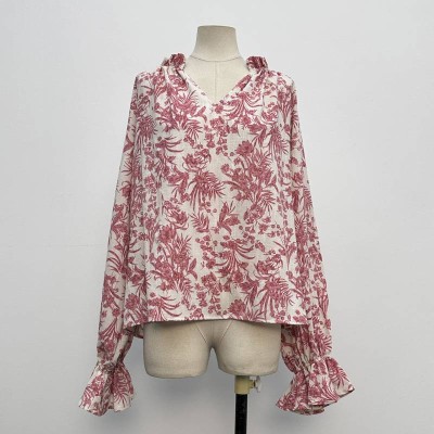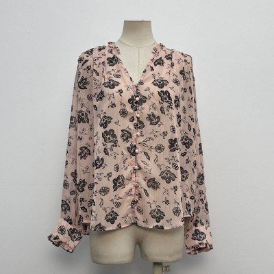 Pink Floral Print V-neck Ruffled Chiffon Shirt Long Sleeve Elegant Commuting Top