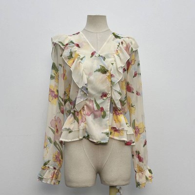 Vintage Blurred Floral Ruffled Chiffon Shirt Elegant Lapel Long Sleeve See-Through Top
