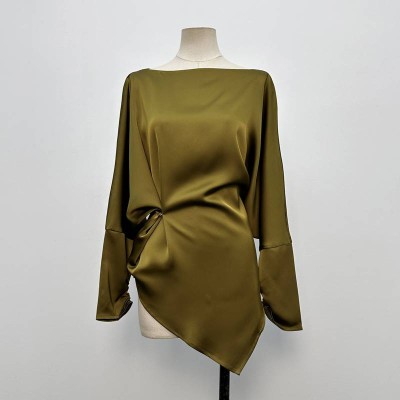 High-end Satin Batwing Sleeve Waist Cinched Top Niche Design Irregular Hem Long Sleeve Top