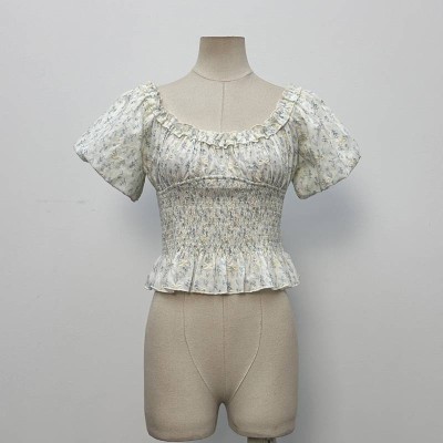French Floral Square Neck Puff Sleeve Waist Cinched Cropped Chiffon Top