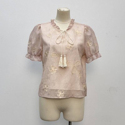 Gentle Pink Apricot Embroidered Lace-up Chiffon Blouse French Puff Sleeve Temperament Top